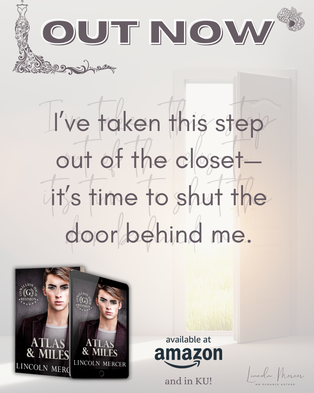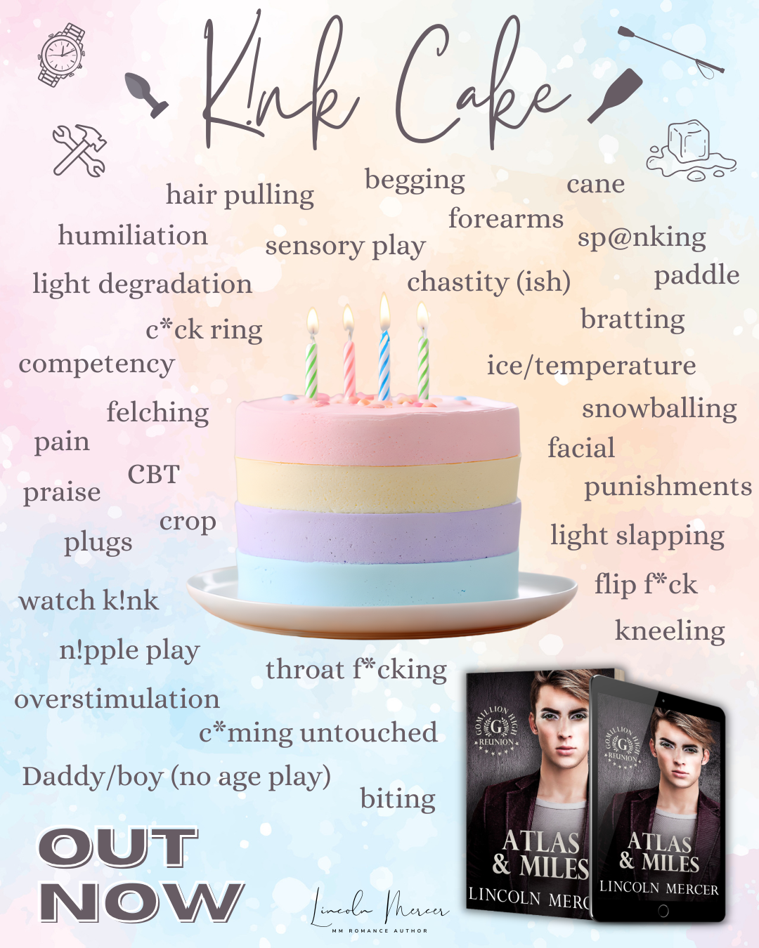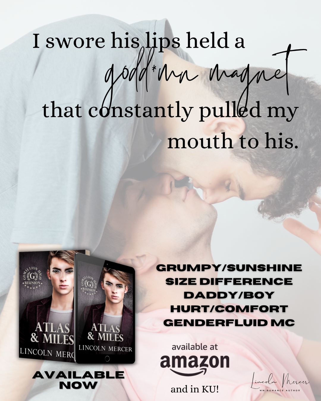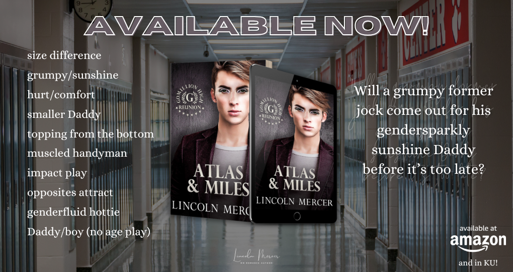 Atlas & Miles is a grumpy/sunshine, opposites attract, size difference, Daddy/boy (no age play) romance between a genderfluid hottie who loves makeup, dresses, and topping from the bottom (usually) and the muscled handyman who needs a love that chooses him for always.